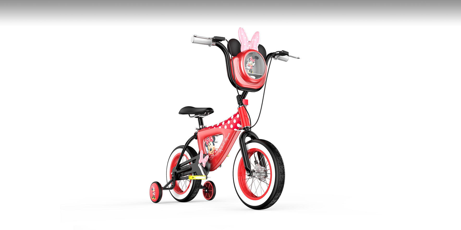 該款自行車配備前后雙剎車系統(tǒng)、兩個(gè)輔助輪、前后反光燈以及鏈條罩,能夠有效保證兒童騎行安全。在車頭立桿的螺絲處設(shè)置了保護(hù)套,車把手采用更圓潤的設(shè)計(jì),從細(xì)節(jié)上避免兒童因?yàn)榭呐龆軅?。座椅采用了可快速調(diào)節(jié)高度的卡扣式設(shè)計(jì),可根據(jù)兒童的身高調(diào)節(jié)合適的座椅高度。通過引入塑料件的應(yīng)用,盡可能隱藏自行車生產(chǎn)中形成的焊縫,提高其美觀程度。同時(shí)部分剎車線的走線可以通過塑料件內(nèi)部排布,避免剎車線的雜亂分部。車頭聲光系統(tǒng)采用了更具活力的舞臺式效果,對兒童具有更好的吸引力。輪胎紋理使用了米妮卡通形象輪廓,使它留下的輪胎印成為一連串的米妮頭像。本產(chǎn)品為兒童自行車市場提供了更高品質(zhì)的選擇,尤其作為迪士尼官方授權(quán)的產(chǎn)品,改變過去在兒童自行車產(chǎn)品上對迪士尼IP形象元素過于簡單直接的運(yùn)用,能夠有效地提高客戶的品牌形象和品牌價(jià)值。