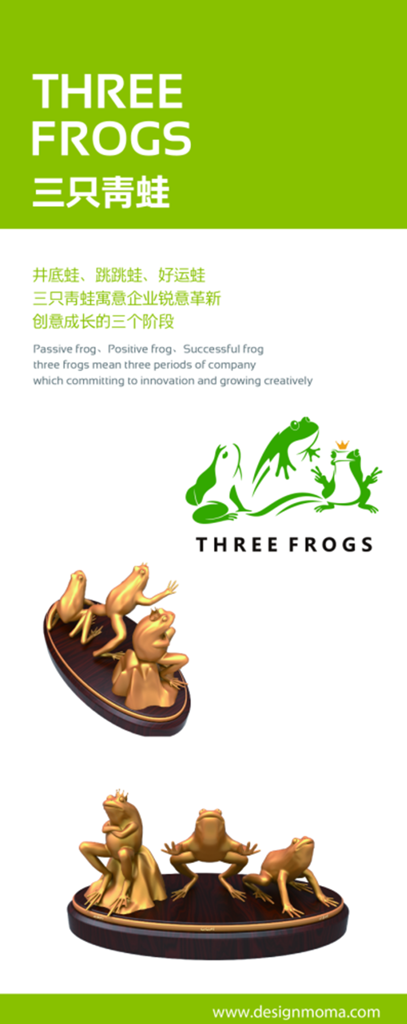 “井底蛙”、“跳跳蛙”、“好運(yùn)蛙”三只青蛙寓意企業(yè)銳意革新創(chuàng)意成長的三個(gè)階段。