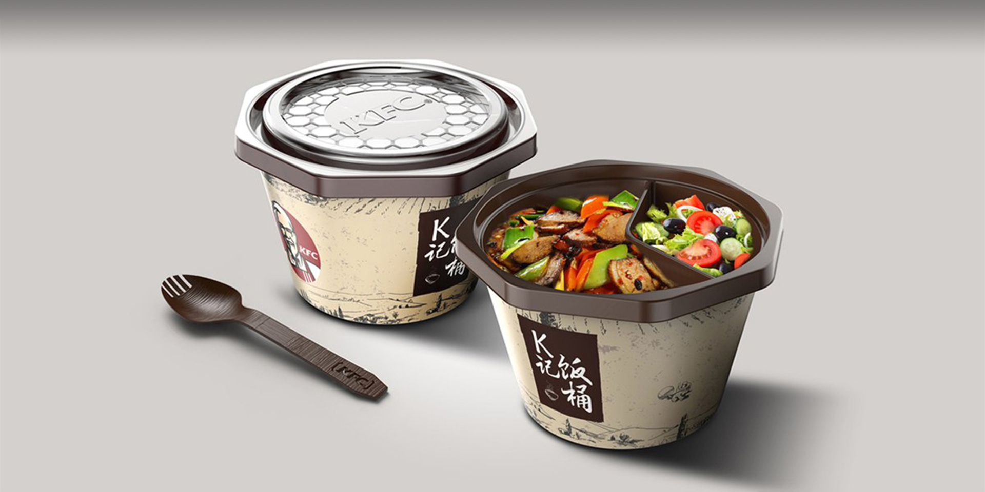 在產(chǎn)品風格上,肯德基希望在保持原先快餐類的高效、便捷特征的基礎(chǔ)上,融入中式本土風格。因此,設(shè)計師用竹紋、木紋的色彩作為主色調(diào),以帶有中國禪意的原木色,體現(xiàn)一碗米飯的認真;同時在桶身上,使用絳紅色,來代表快餐的原有特性;而深褐色的內(nèi)壁,正好可以突出鮮艷可口的菜肴,更能勾起消費者的食欲。經(jīng)過大量的方案探討和嘗試,我們選擇八角形作為桶身的主要造型語言,因為在中國文化中,八角形態(tài)代表著合家歡樂、團圓美滿、堅實可靠,這與肯德基期待的產(chǎn)品情感訴求相一致。從工程上來說,八角形非常穩(wěn)固,符合餐盒的強度標準,同時八角的形態(tài)也方便消費者拿取餐盤。