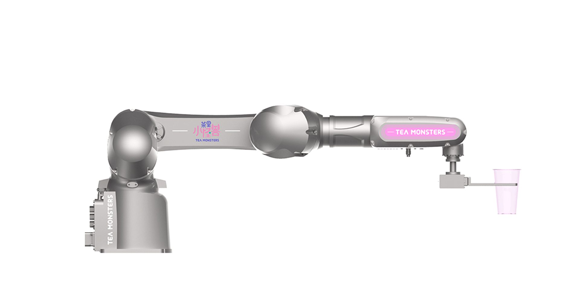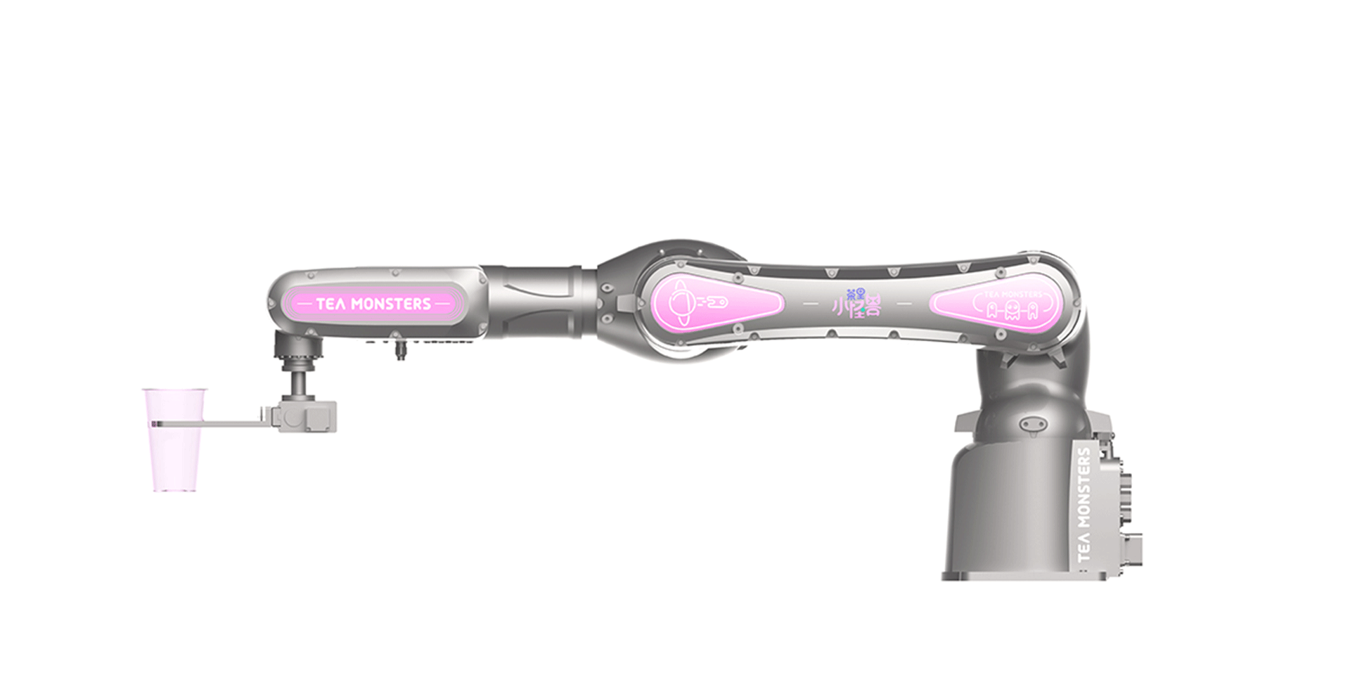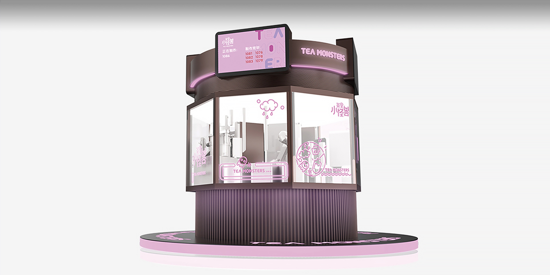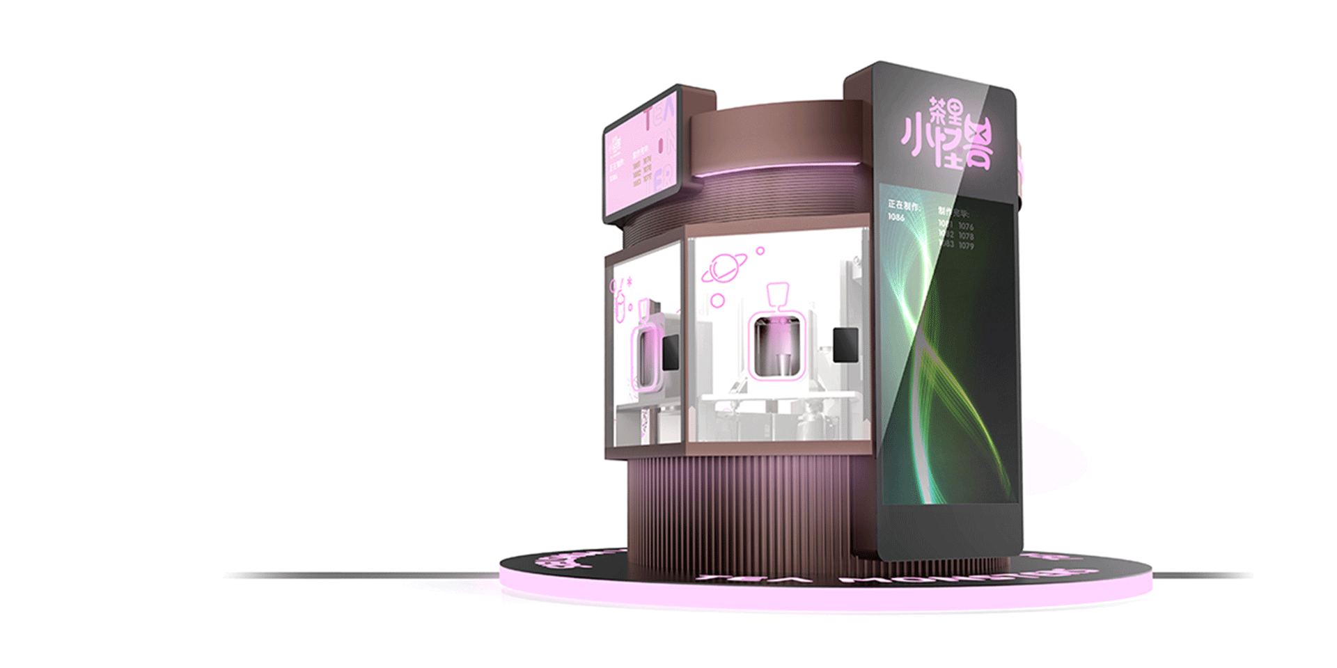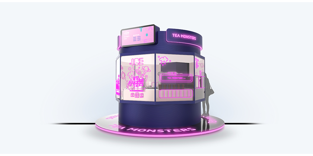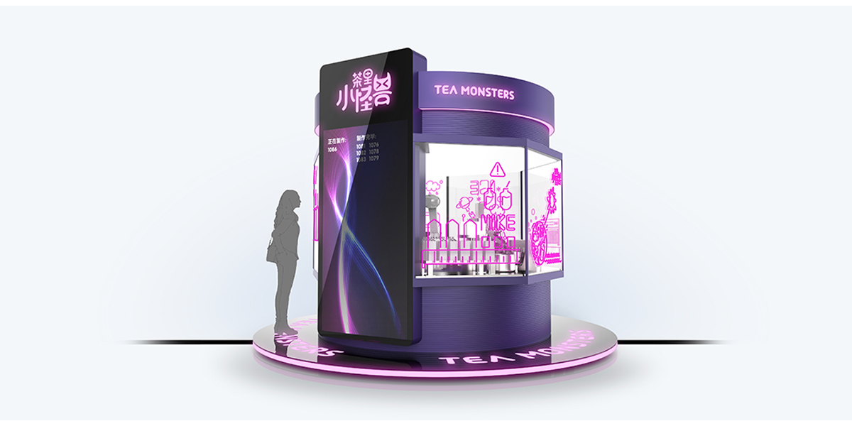 “茶里小怪獸”以為年輕人提供 24 小時(shí)全天候優(yōu)質(zhì)奶茶的夢(mèng)想為出發(fā)點(diǎn),打造一款自助奶茶站。 基于靈活機(jī)械臂,采用環(huán)繞式玻璃窗口設(shè)計(jì),顧客可以 360°觀看一杯優(yōu)質(zhì)奶茶從煮茶、制冰到煮珍珠、加奶的一系列制作過程。窗口以小怪獸為主題,搭配炫彩霓虹,以全封閉的奶茶制作環(huán)境,給用戶帶來全新的使用體驗(yàn)。