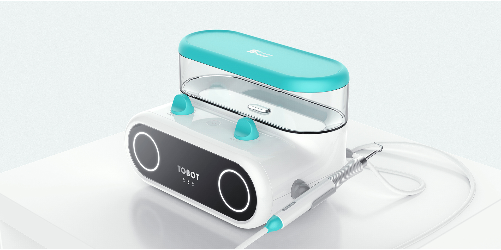 該產(chǎn)品專為兒童而設(shè)計(jì)。產(chǎn)品開發(fā)的目標(biāo)是希望讓兒童更配合醫(yī)生使用潔牙機(jī)為其清洗牙齒。 這款潔牙機(jī)整體采用圓潤、 仿生的造型風(fēng)格,并加入智能交互系統(tǒng),通過眼部燈光不同的變化,讓孩子與機(jī)器形成互動(dòng)。產(chǎn)品采用了分離式儲(chǔ)水盒設(shè)計(jì),可通過實(shí)體按鍵對(duì)水流、水壓進(jìn)行調(diào)節(jié),讓用戶方便地加水、 清洗,并可以觀察用水的剩余情況。