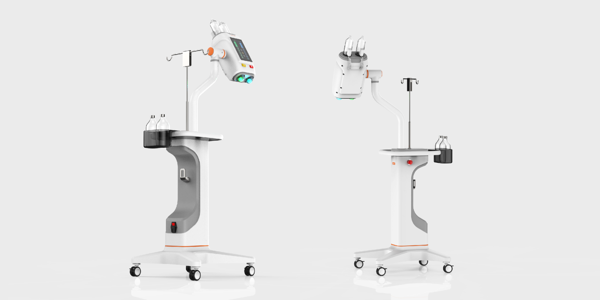 該高壓注射器整體造型采用簡約幾何,符合當(dāng)下醫(yī)療造型趨勢。高壓注射器適用于CT室內(nèi)各種增強造影,其采用雙筒設(shè)計,可同時注射對比劑與生理鹽水,相比傳統(tǒng)單筒高壓注射器,可以更有效節(jié)約對比劑,減輕患者體內(nèi)代謝負(fù)荷;自動吸藥,降低操作難度,節(jié)約準(zhǔn)備時間,大大提高技師及護士的工作效率。Wave高壓注射器的雙流注射功能可以提供差異化顯影、減少對比劑偽影,便于醫(yī)生精準(zhǔn)診斷。在安全性上,Wave高壓注射器提供實時壓力曲線,監(jiān)測壓力變化,減少滲漏、降低患者風(fēng)險;并有兩級超壓報警,當(dāng)接近設(shè)定的壓力閾值時,會進行預(yù)警,超過壓力限制會有聲光報警并停止注射程序,保證患者注射安全。