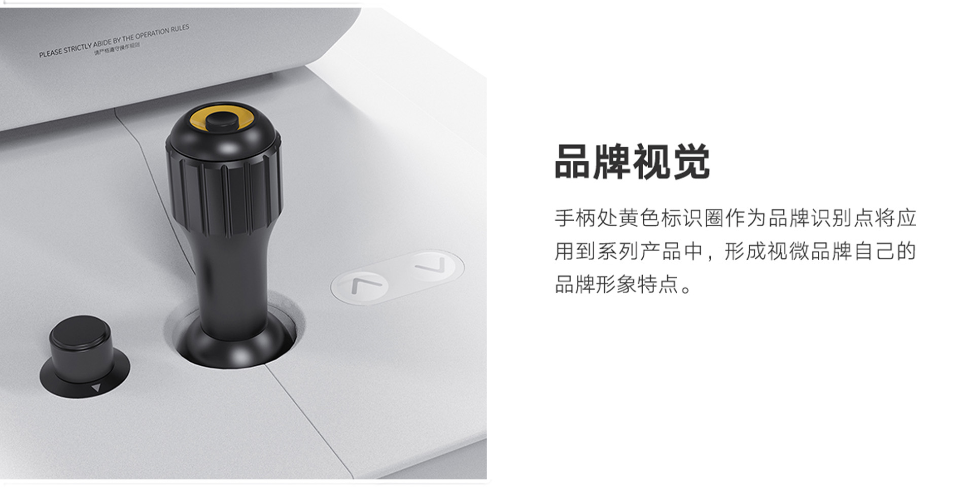 視微光學(xué)相干斷層掃描儀率先采用模塊化設(shè)計(jì)思路,將整機(jī)分類成多個(gè)核心組合部件,形成多功能的整合與搭配。在分析了整個(gè)醫(yī)療行業(yè)的發(fā)展趨勢(shì)之后,最終以數(shù)碼化的設(shè)計(jì)思路,打造一款在行業(yè)內(nèi)更加年輕化,更加具有前瞻性的戰(zhàn)略性產(chǎn)品。完整的大曲面包裹住主機(jī)的所有結(jié)構(gòu)件,深灰與白色的分色,整機(jī)充滿未來與科技感,賦予產(chǎn)品引領(lǐng)行業(yè)的使命;嵌入式臉托,隱藏式摳手等細(xì)節(jié)的設(shè)計(jì),盡量保證產(chǎn)品設(shè)計(jì)元素的統(tǒng)一性,增強(qiáng)一體性。手柄處黃色標(biāo)識(shí)圈作為品牌識(shí)別點(diǎn)將應(yīng)用到系列產(chǎn)品中,形成視微品牌自己的品牌形象特點(diǎn)。在外觀和功能引導(dǎo)上,去除多余的干擾因素,目的是讓用戶更好地體驗(yàn)使用過程和使用環(huán)境或?qū)W⒂谇胺降娜蝿?wù),順利完成檢查的工作。