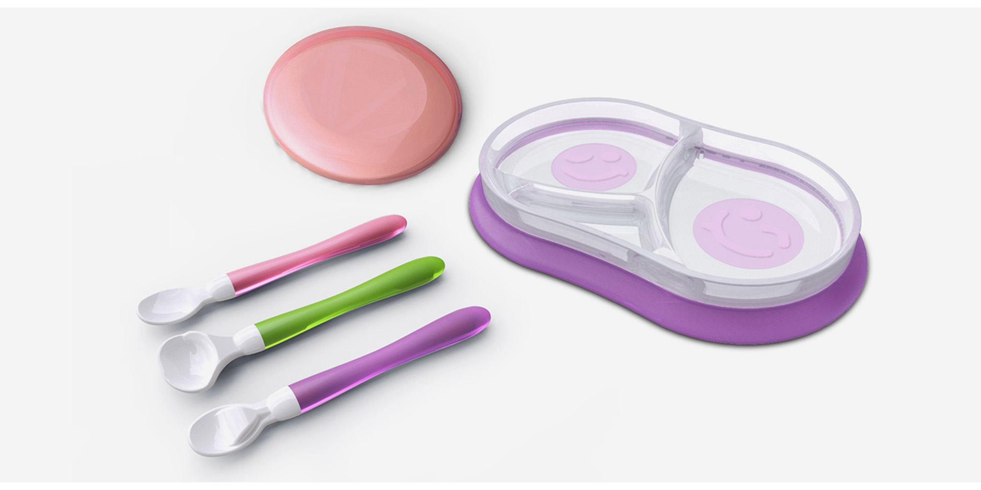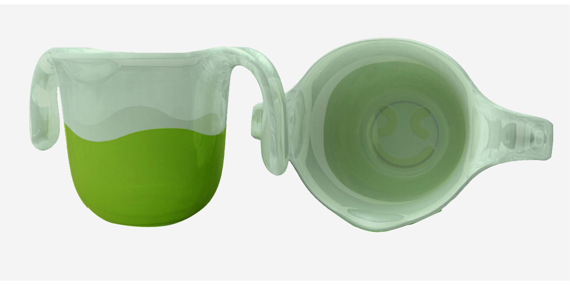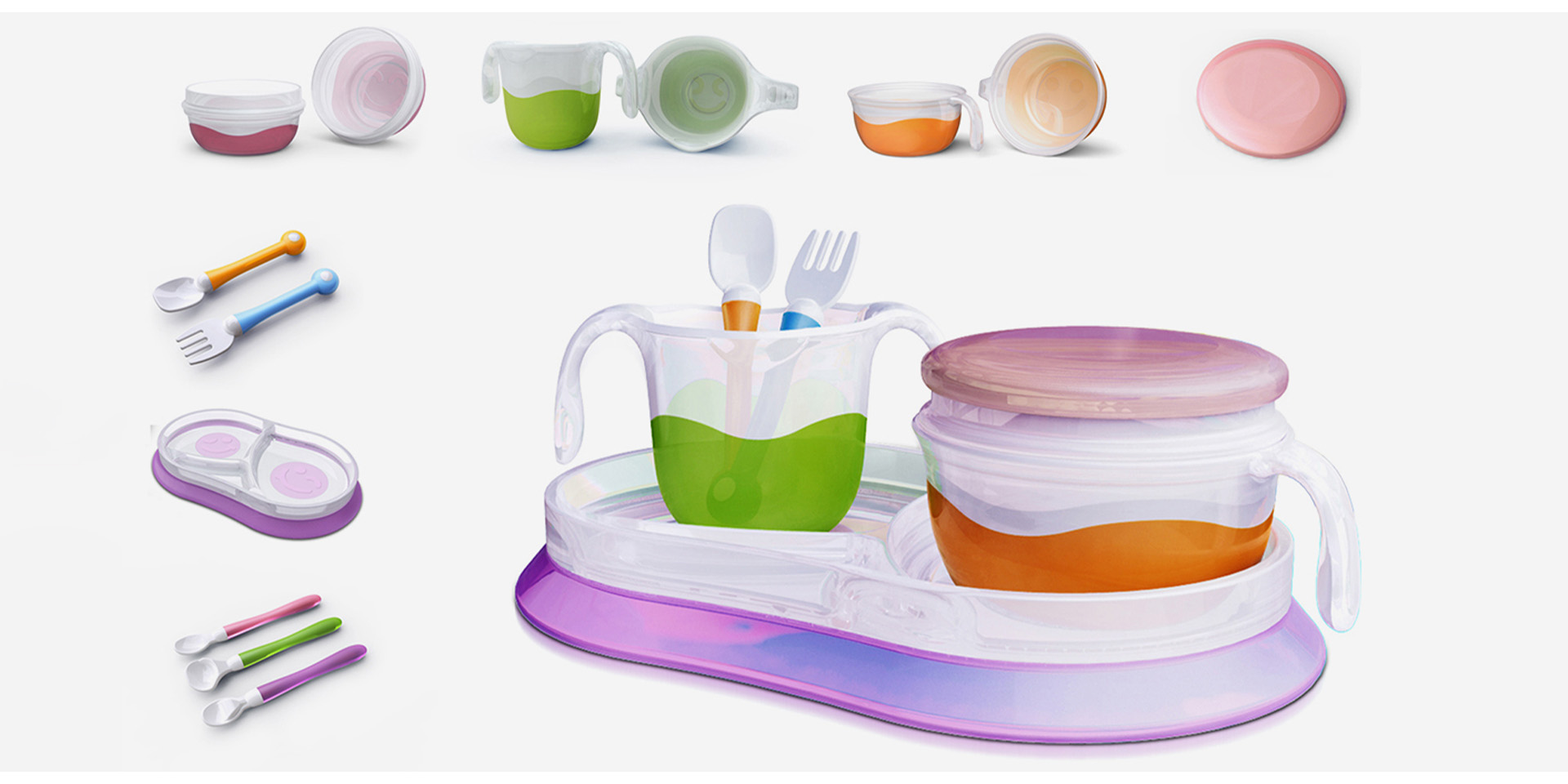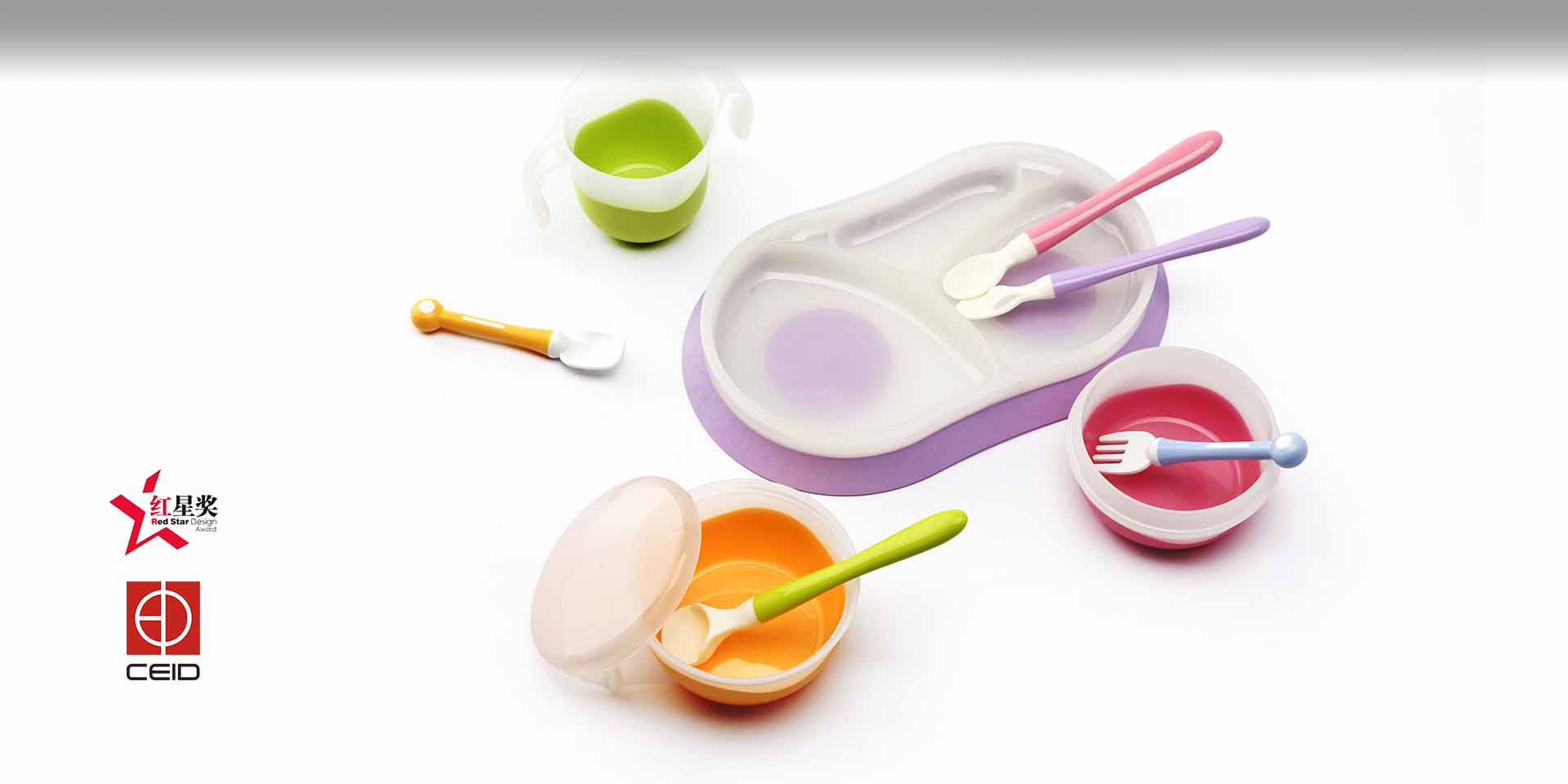 設(shè)計中我們采用柔和圓潤的造型風(fēng)格,在充分調(diào)研了廣大消費者的現(xiàn)實需求后,整個系列材用“沿連把”的基本造型思路,并配合微妙的嬰兒口唇發(fā)育特點,對飲口及勺頭仔細推敲,同時結(jié)合圖案色彩激發(fā)孩子的好奇和歡喜心理。最終滿足從母親哺喂嬰兒輔食,到嬰兒自主習(xí)慣使用與成人相同的餐具這一學(xué)習(xí)適應(yīng)過程的種種人機工程,最終鼓勵幫助孩子學(xué)會自己獨立地使用餐具。一方面其形態(tài)及把手可以完美滿足媽媽單手操作的需求,為母親提供方便愉快的育兒體驗, 另一方面可愛的形態(tài)配合若隱若現(xiàn)的笑臉圖案讓孩子更有興趣把碗里的飯吃完。真正做到了媽媽用著稱心、放心,寶寶用著開心、貼心。