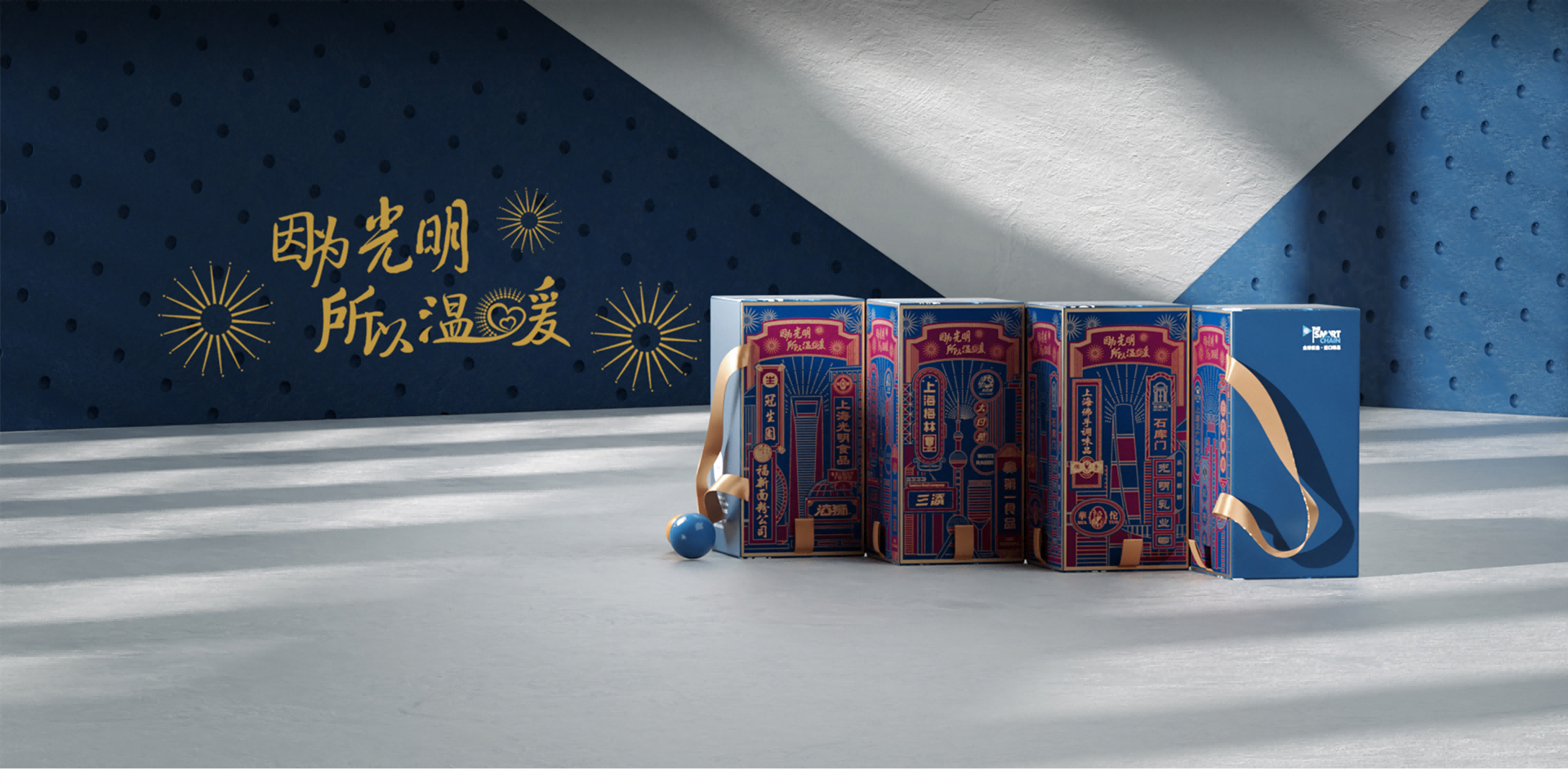 光明食品的老字號(hào)伴手禮盒設(shè)計(jì),融入了光明集團(tuán)旗下現(xiàn)有的老字號(hào)品牌,結(jié)合悠久的海派文化底蘊(yùn),以新穎方式呈現(xiàn),展現(xiàn)“上海味道,上海腔調(diào)”。大膽而又不失復(fù)古的紅藍(lán),在形成強(qiáng)視覺沖擊的同時(shí),凸顯著成熟穩(wěn)重的氣質(zhì)。