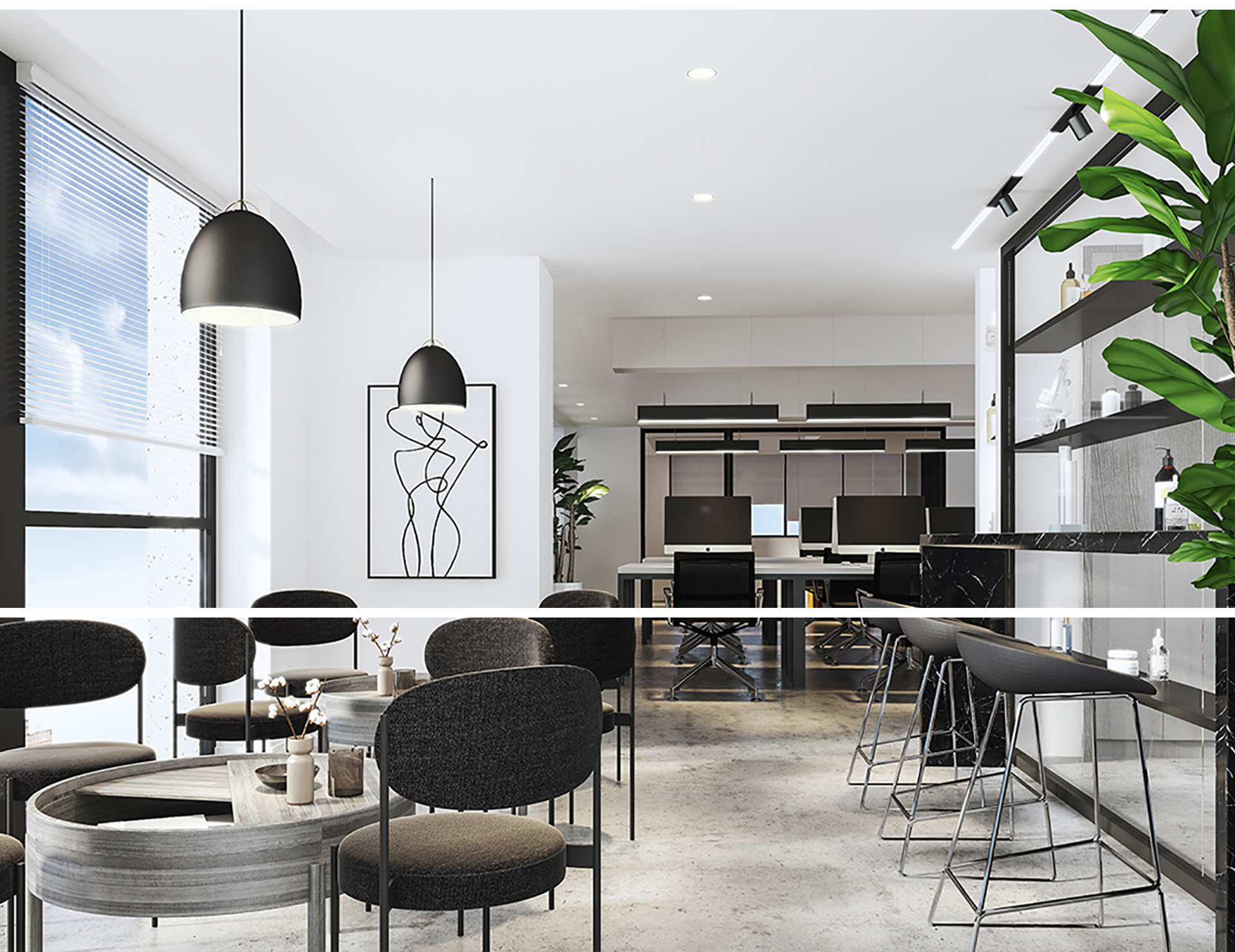 經(jīng)歷了無數(shù)次的思想沖擊、解構(gòu)和重組后,決定以高效協(xié)同、大量?jī)?chǔ)物、自然放松、優(yōu)美曲線等關(guān)鍵詞,組成設(shè)計(jì)要點(diǎn)。空間平面呈規(guī)整的L型,設(shè)計(jì)師將空間所需的所有的不規(guī)整功能區(qū)如:衛(wèi)生間、水吧一一隱藏,把**的舞臺(tái)留給辦公。