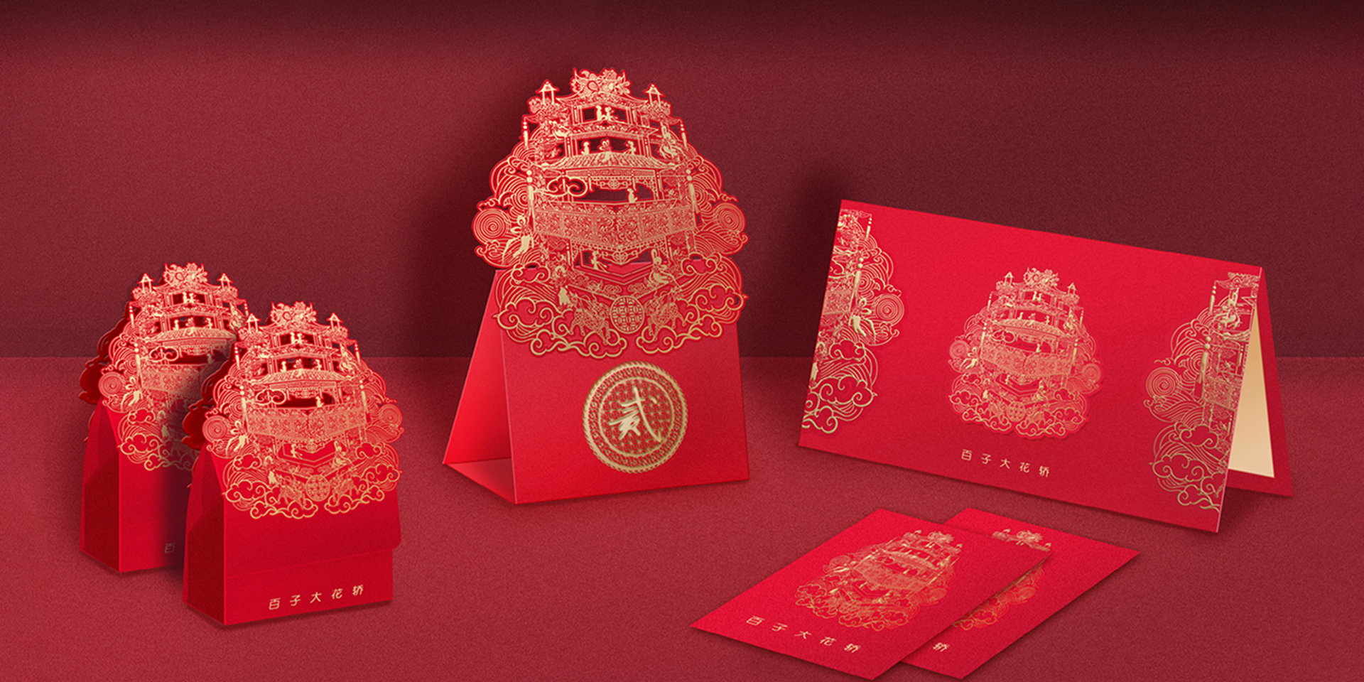 上海市歷史博物館館藏民國(guó)百子大禮轎是制作于上世紀(jì)三十年代的甬式大花轎,集多種非物質(zhì)文化遺產(chǎn)技藝于一身,工藝精湛,美輪美奐;同時(shí)它又是上海移民文化、民俗文化與海派文化融合的重要表征,實(shí)為館藏精品重器。當(dāng)木馬設(shè)計(jì)有幸看到花轎真顏的那一刻,便對(duì)它肅然起敬,更激發(fā)了為花轎做好喜事衍生品的愿望,將它的美融入人們的喜事生活?;ㄞI有"軟衣式"和"硬衣式"兩種。"軟衣式"是在轎框的四周罩以紅色的綾羅帷幕,硬衣式指花轎的全身都是木制結(jié)構(gòu),造型類似四方四角出檐的寶塔頂形。甬式花轎屬于該類型。該花轎制作采用圓雕、浮雕、貼金、涂銀、朱漆等裝飾手法,呈現(xiàn)數(shù)百個(gè)人物和花鳥(niǎo)蟲(chóng)獸等吉祥圖案,配上彩繪的鏡片水銀玻璃和艷麗的金銀彩繡轎衣,朱金相間,光彩奪目,美輪美奐。