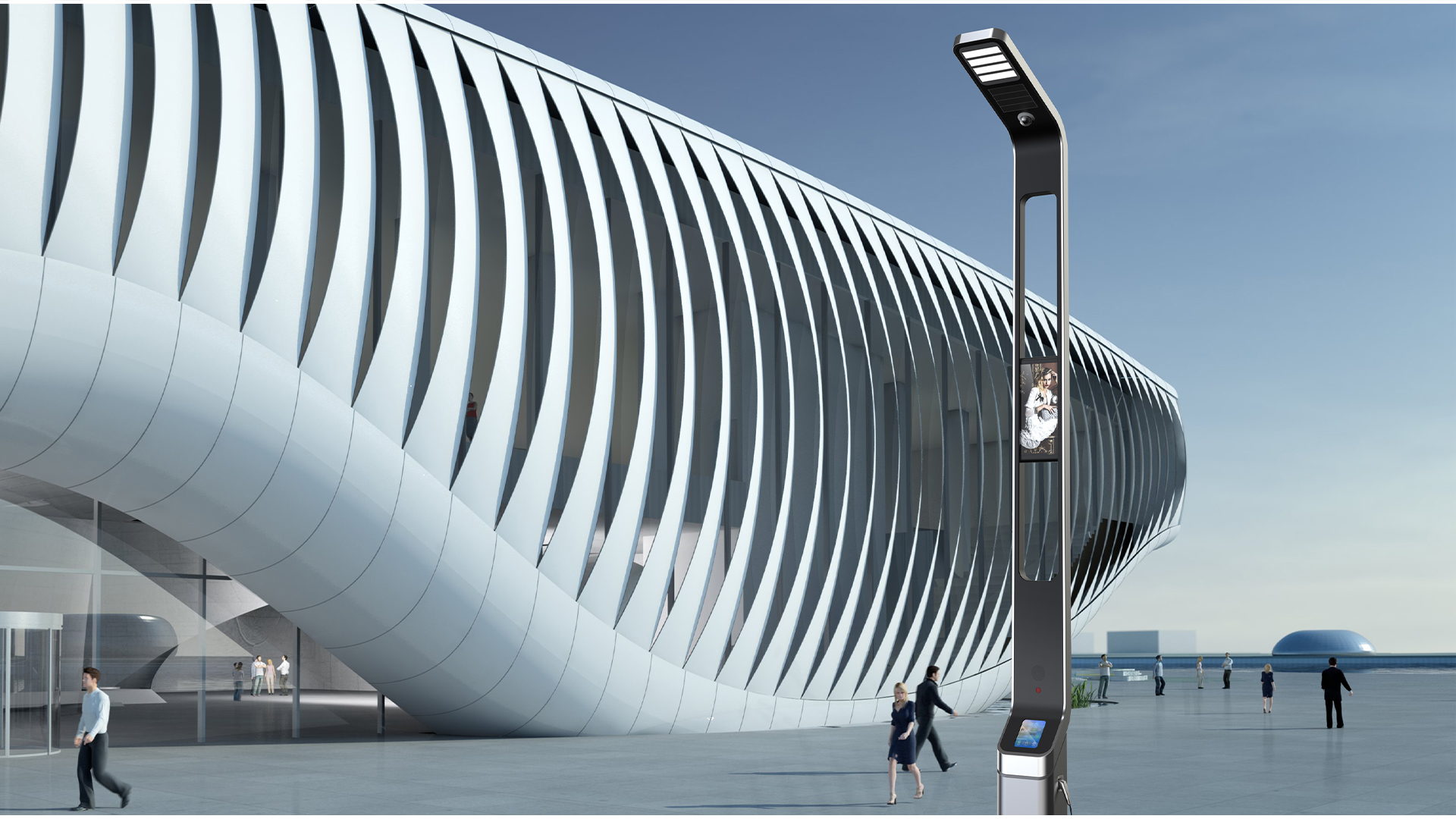 現(xiàn)代簡(jiǎn)約型智慧燈桿旨在一站式集成照明、監(jiān)控、Wi-Fi覆蓋、天氣監(jiān)測(cè)、空氣檢測(cè)以及廣告宣傳、公共充電系統(tǒng)等功能。造型簡(jiǎn)約、科幻,具有十足的未來(lái)感。每一個(gè)路燈頂端帶有光伏發(fā)電系統(tǒng),不僅供路燈自身使用還接入城市電網(wǎng)為城市供電。多模塊化組件的系統(tǒng)設(shè)計(jì),使產(chǎn)品可以根據(jù)不同的場(chǎng)景需要進(jìn)行靈活的功能組合,滿足客戶的定利需求。模塊化的粗合利用,可以使整個(gè)產(chǎn)品生命周期中的采購(gòu)、物流、制造和服務(wù)資源趨于簡(jiǎn)化。該產(chǎn)品的高度集成大大減少了功能組件的開(kāi)發(fā)費(fèi)用,一臺(tái)路燈就能涵蓋城市大多數(shù)街道的功能需求具有廣泛的適用性。