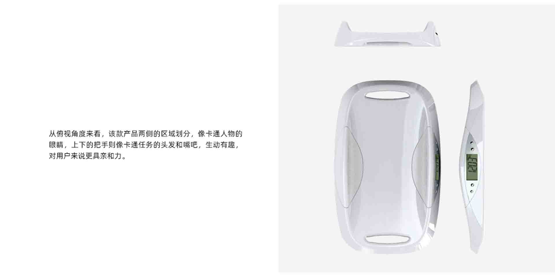 可瑞爾嬰兒秤是基于消費(fèi)者需求的市場(chǎng)導(dǎo)向型產(chǎn)品,體現(xiàn)了設(shè)計(jì)師對(duì)用戶生活細(xì)節(jié)的關(guān)注??紤]到產(chǎn)品本身的特殊性,首先從人機(jī)工程學(xué)入手,在秤的兩側(cè)采用左右隆起的設(shè)計(jì),保證嬰兒使用時(shí)的舒適。秤體上的每一根線條都具有功能性意義,在實(shí)現(xiàn)裝飾的同時(shí),完成了秤體功能的劃分,左右分割的線條劃分出的隆起區(qū)域采用磨砂材質(zhì),通過穩(wěn)定嬰兒來加強(qiáng)測(cè)量結(jié)果的穩(wěn)定性;側(cè)邊的線條與隆起的線條穿插,形成了控制面板區(qū)域。該嬰兒秤憑借其穩(wěn)重的造型與柔和的線條以及合理巧妙的功能布局名成為市場(chǎng)導(dǎo)向設(shè)計(jì)的典型范例??扇馉栆跃軠y(cè)量著稱,對(duì)測(cè)量與健康管理行業(yè)需求有著豐富的經(jīng)驗(yàn)和理解,設(shè)計(jì)與技術(shù)的結(jié)合開辟了測(cè)量行業(yè)新道路,為用戶提供更優(yōu)質(zhì)的服務(wù)與體驗(yàn)。