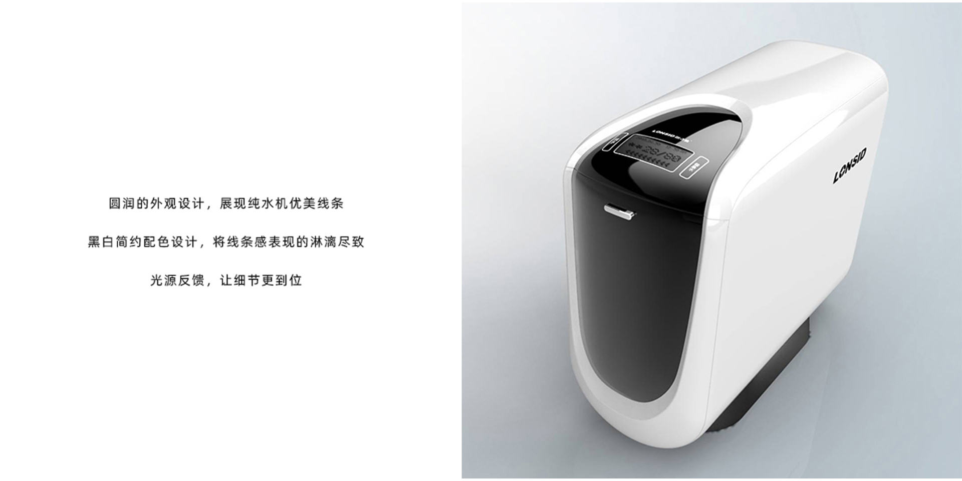 都市時(shí)尚純水機(jī)是為保證家庭飲用水健康而開發(fā)的獨(dú)立式純水機(jī)。設(shè)計(jì)師運(yùn)用仿生的設(shè)計(jì)原理,通過對(duì)水滴形態(tài)的進(jìn)一步研究,打造出以純白色為主體的一款圓潤(rùn)飽滿又富有時(shí)尚氣息的純水機(jī)。這款純水機(jī)只需讓自來(lái)水經(jīng)過純水機(jī)過濾馬上就可以轉(zhuǎn)化成無(wú)污染的飲用水。設(shè)計(jì)中我們充分考慮到使用環(huán)境的因素,所以外觀的形態(tài)既可以置于桌面也可以放入櫥柜中。這款純水機(jī)是用來(lái)滿足家庭對(duì)飲用水健康所特別開發(fā)的獨(dú)立式純水機(jī)。一款圓潤(rùn)飽滿又富有時(shí)尚氣息的純水機(jī),人機(jī)互動(dòng)的背光屏幕界面設(shè)計(jì)使用戶直觀的了解其使用狀態(tài)。這款純水機(jī)設(shè)計(jì),使用最基本的黑白色設(shè)計(jì)語(yǔ)言,使其形態(tài)和交互方式與用戶熟悉的家庭電器基本一致,在統(tǒng)一中尋求變化。