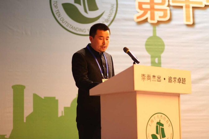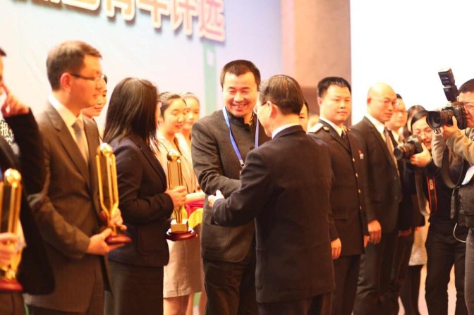 丁偉從全國(guó)政協(xié)常委、上海市政協(xié)副主席周漢民領(lǐng)導(dǎo)手中接過(guò)這意義深刻的獎(jiǎng)杯