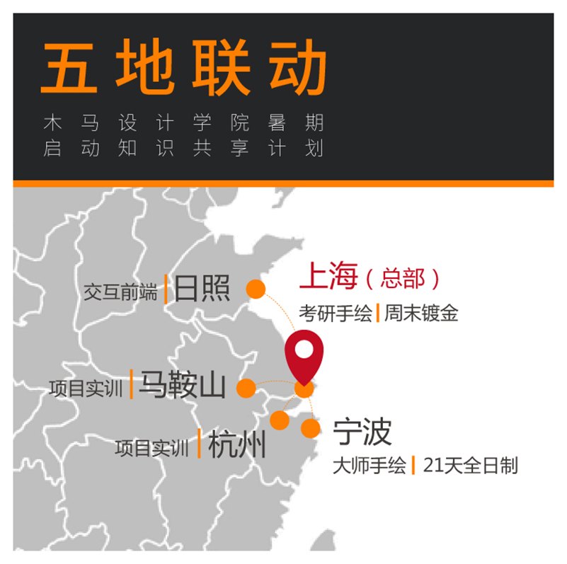 木馬設(shè)計(jì)學(xué)院總部坐落于國(guó)際化大都市上海,并以上海為教育輻射基地,分別在寧波、日照、杭州、馬鞍山四個(gè)區(qū)域開展教育分院,搭建出相互鏈動(dòng)、高效覆蓋的教育模式。