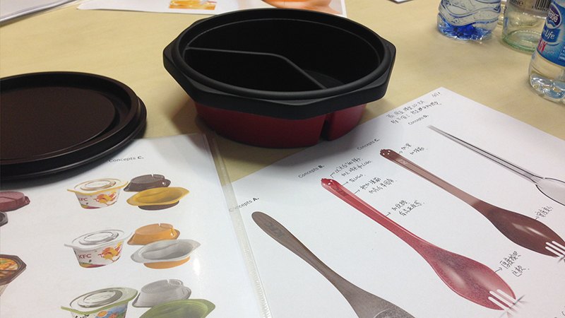 開(kāi)始設(shè)計(jì)之初,設(shè)計(jì)師通過(guò)約見(jiàn)和暗訪兩種方式,實(shí)地觀察了肯德基幕后廚房,對(duì)中式快餐現(xiàn)有的制作流程進(jìn)行了深度了解,發(fā)現(xiàn)不合理現(xiàn)象,例如現(xiàn)有飯盒在層疊狀態(tài)下不易取出,這個(gè)小小的繁瑣動(dòng)作極大的影響了工作人員配餐的速度,在這種客流量巨大的快餐市場(chǎng)中,每一秒鐘都必須珍惜。設(shè)計(jì)師還指出了其他可以通過(guò)設(shè)計(jì)修正的創(chuàng)新點(diǎn),通過(guò)這些創(chuàng)新點(diǎn),來(lái)指導(dǎo)我們未來(lái)的設(shè)計(jì)方向。(下圖)