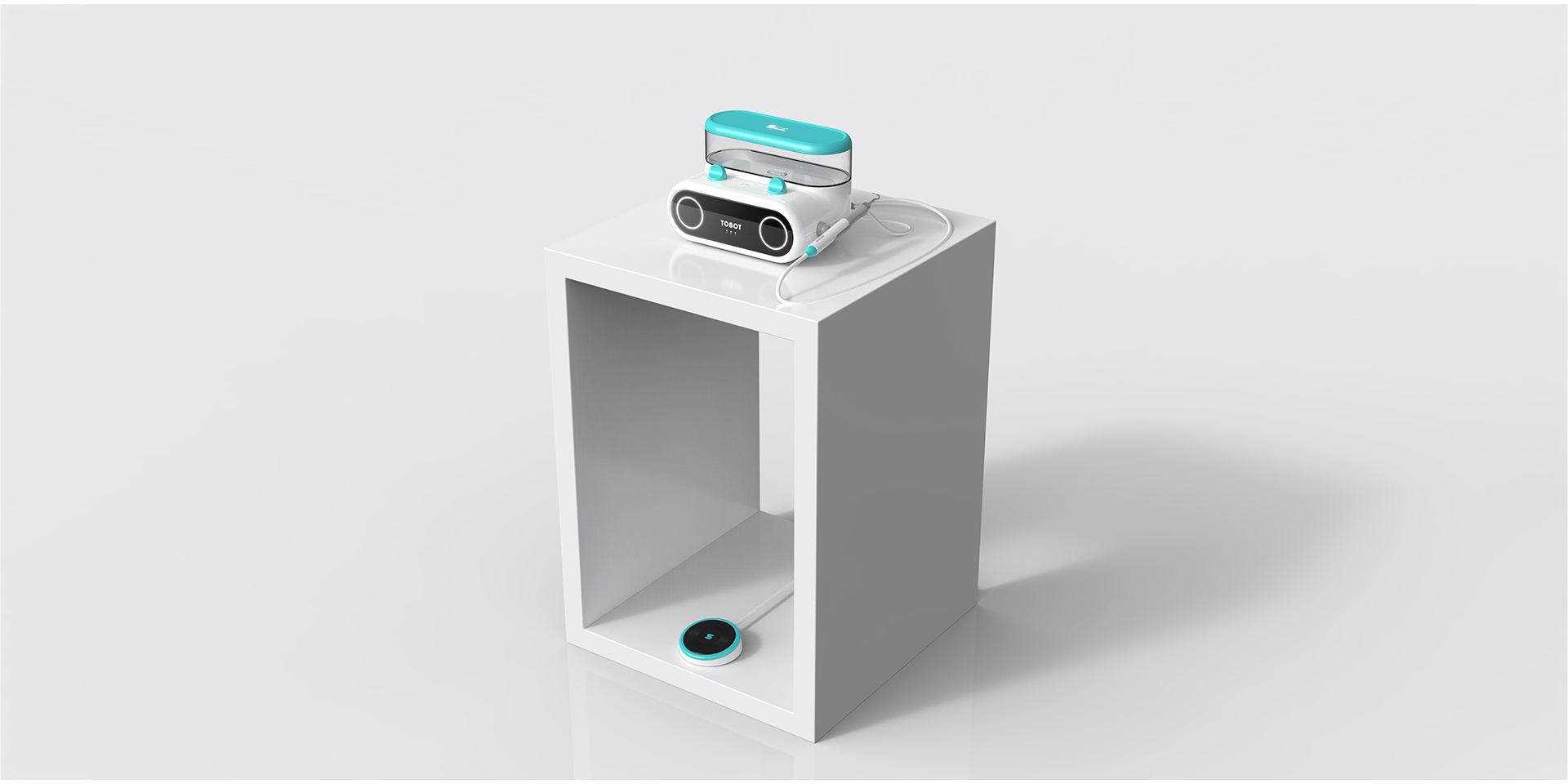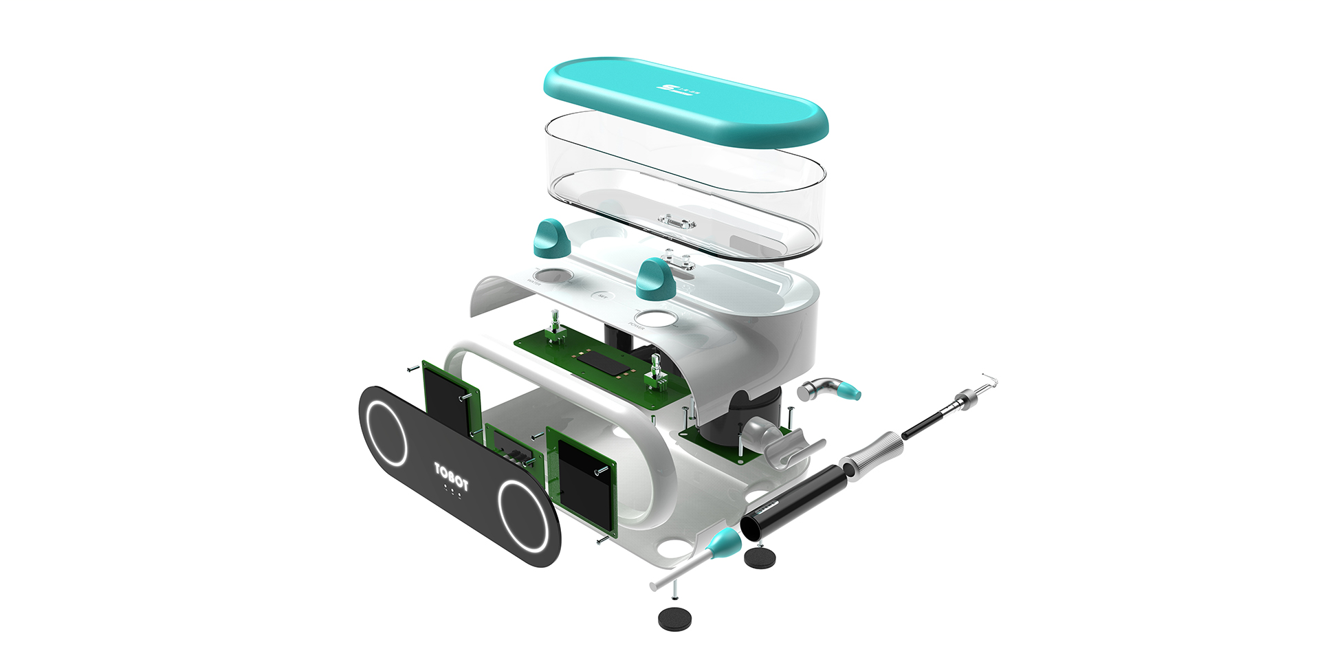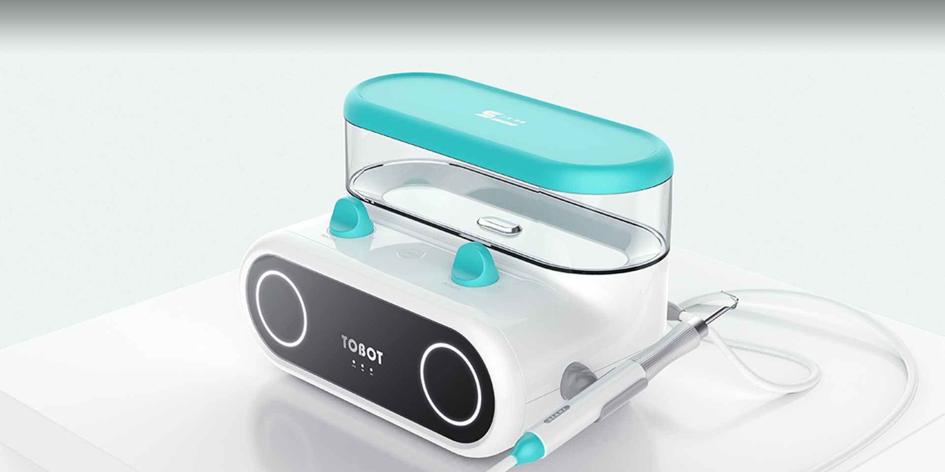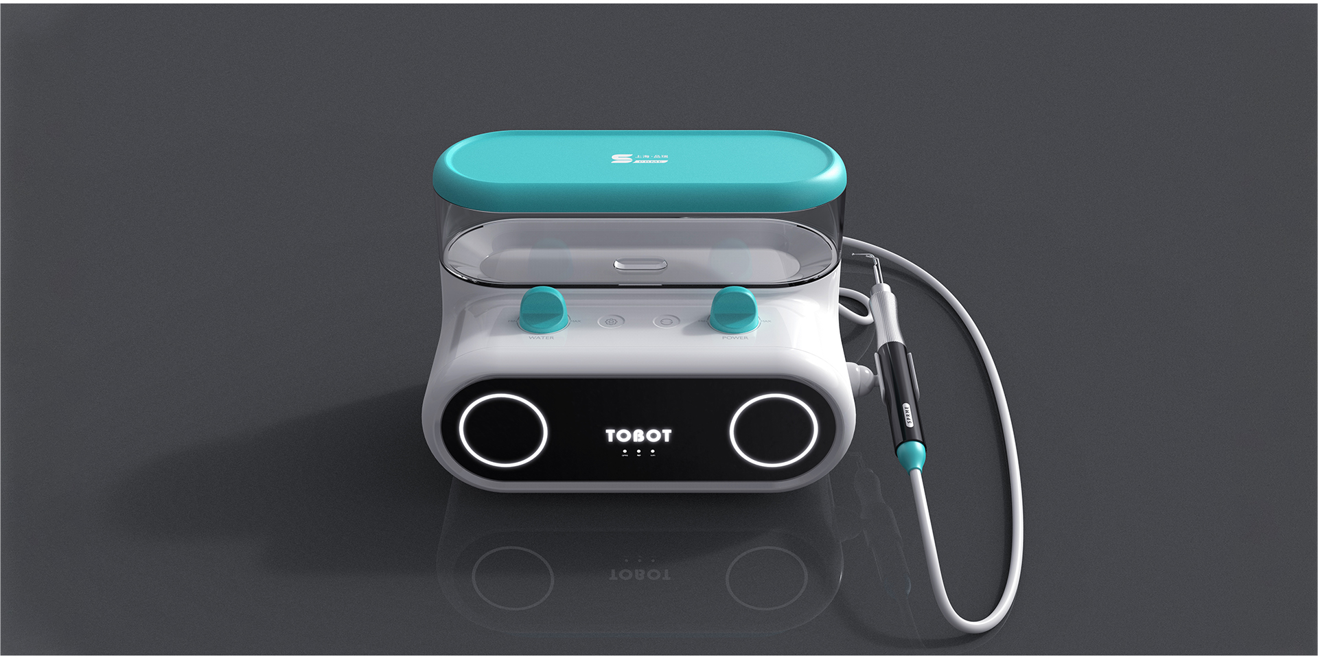 該產(chǎn)品專為兒童而設(shè)計(jì)。產(chǎn)品開發(fā)的目標(biāo)是希望讓兒童更配合醫(yī)生使用潔牙機(jī)為其清洗牙齒。 這款潔牙機(jī)整體采用圓潤、 仿生的造型風(fēng)格,并加入智能交互系統(tǒng),通過眼部燈光不同的變化,讓孩子與機(jī)器形成互動(dòng)。產(chǎn)品采用了分離式儲(chǔ)水盒設(shè)計(jì),可通過實(shí)體按鍵對(duì)水流、水壓進(jìn)行調(diào)節(jié),讓用戶方便地加水、 清洗,并可以觀察用水的剩余情況。